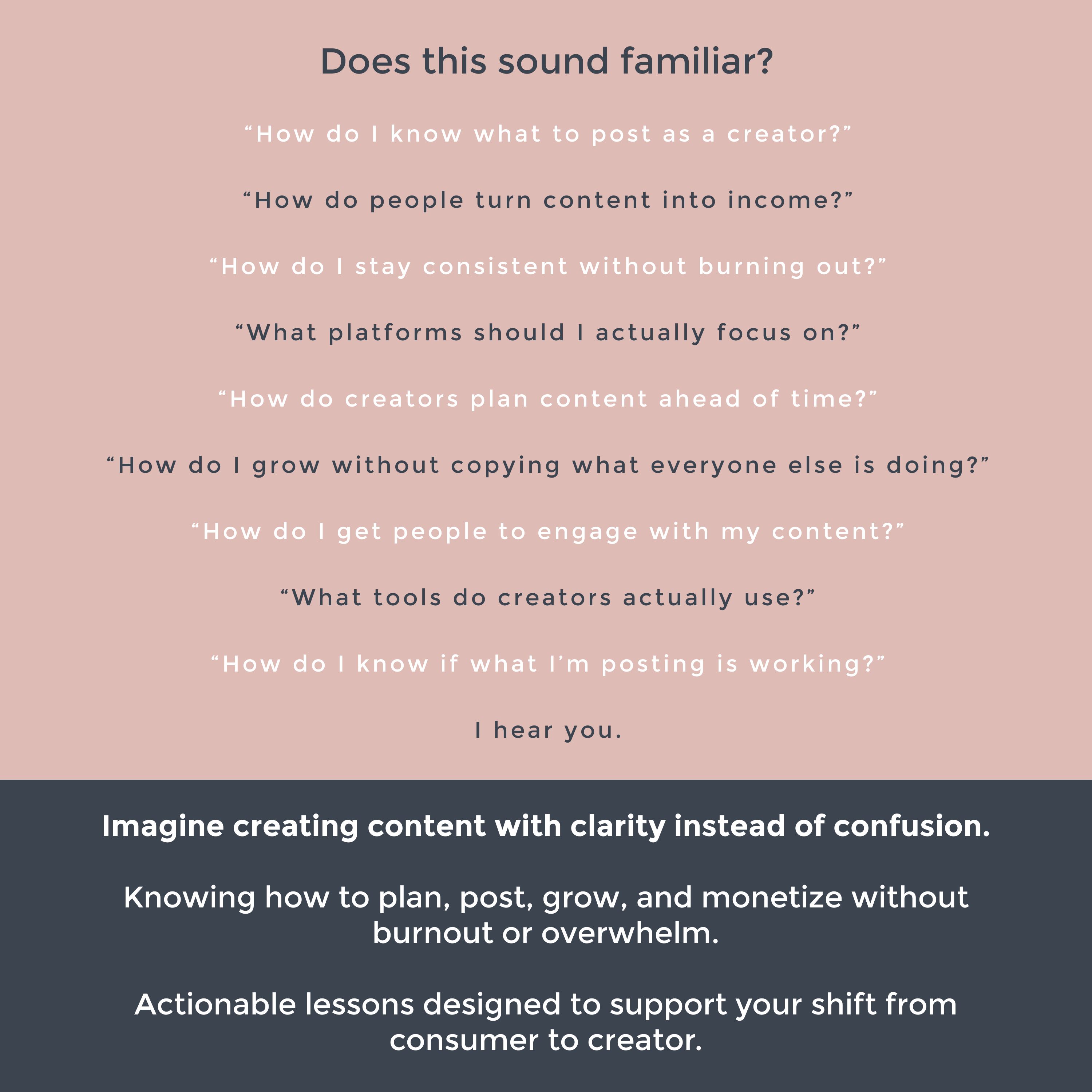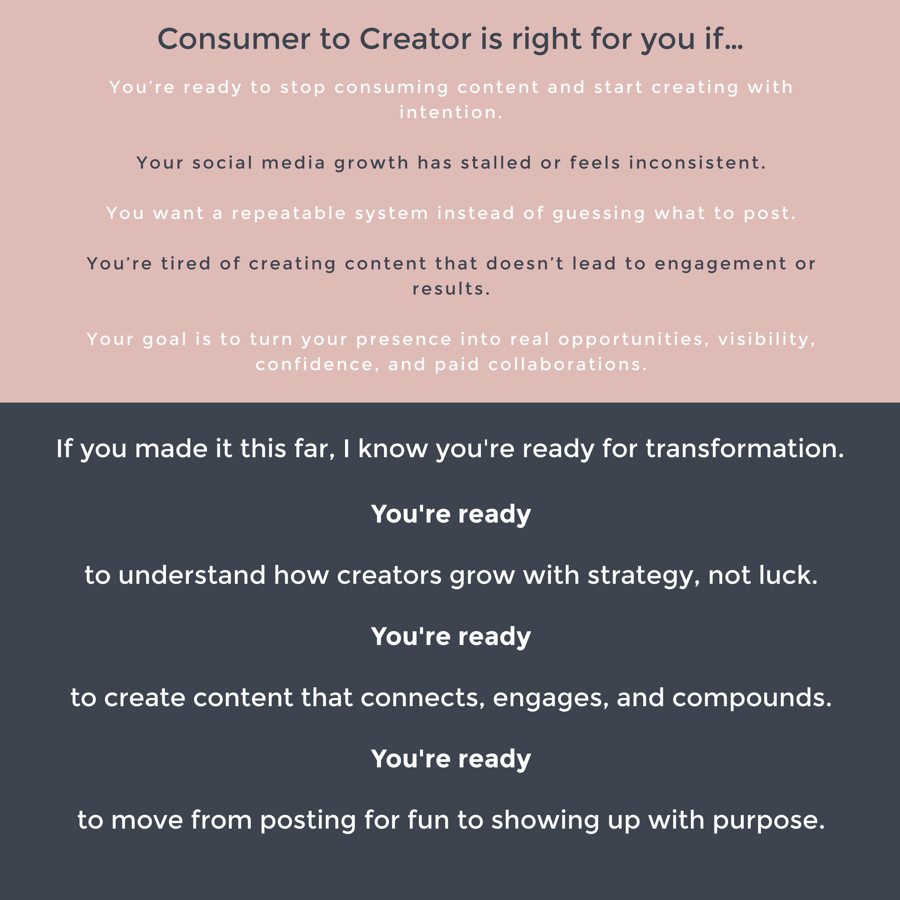 Do I need a big following to get results? No. Consumer to Creator focuses on systems, clarity, and consistency, not follower count. Many creators start seeing stronger engagement and clearer direction long before their audience grows.