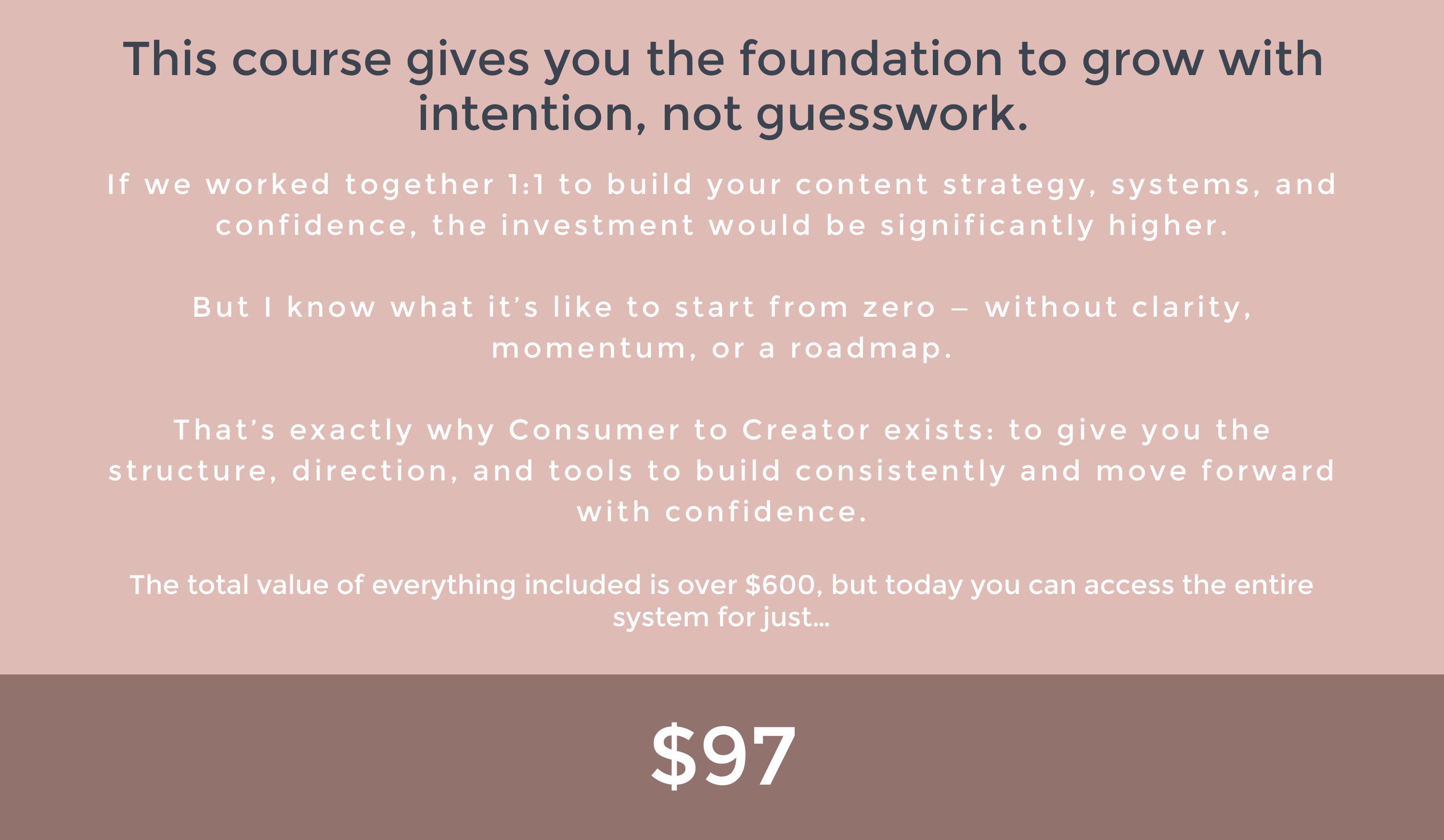 Is this course beginner-friendly? Absolutely. Consumer to Creator is designed for beginners and creators who feel stuck or inconsistent. You don’t need a large following, fancy equipment, or prior experience, just a willingness to show up and apply what you learn.