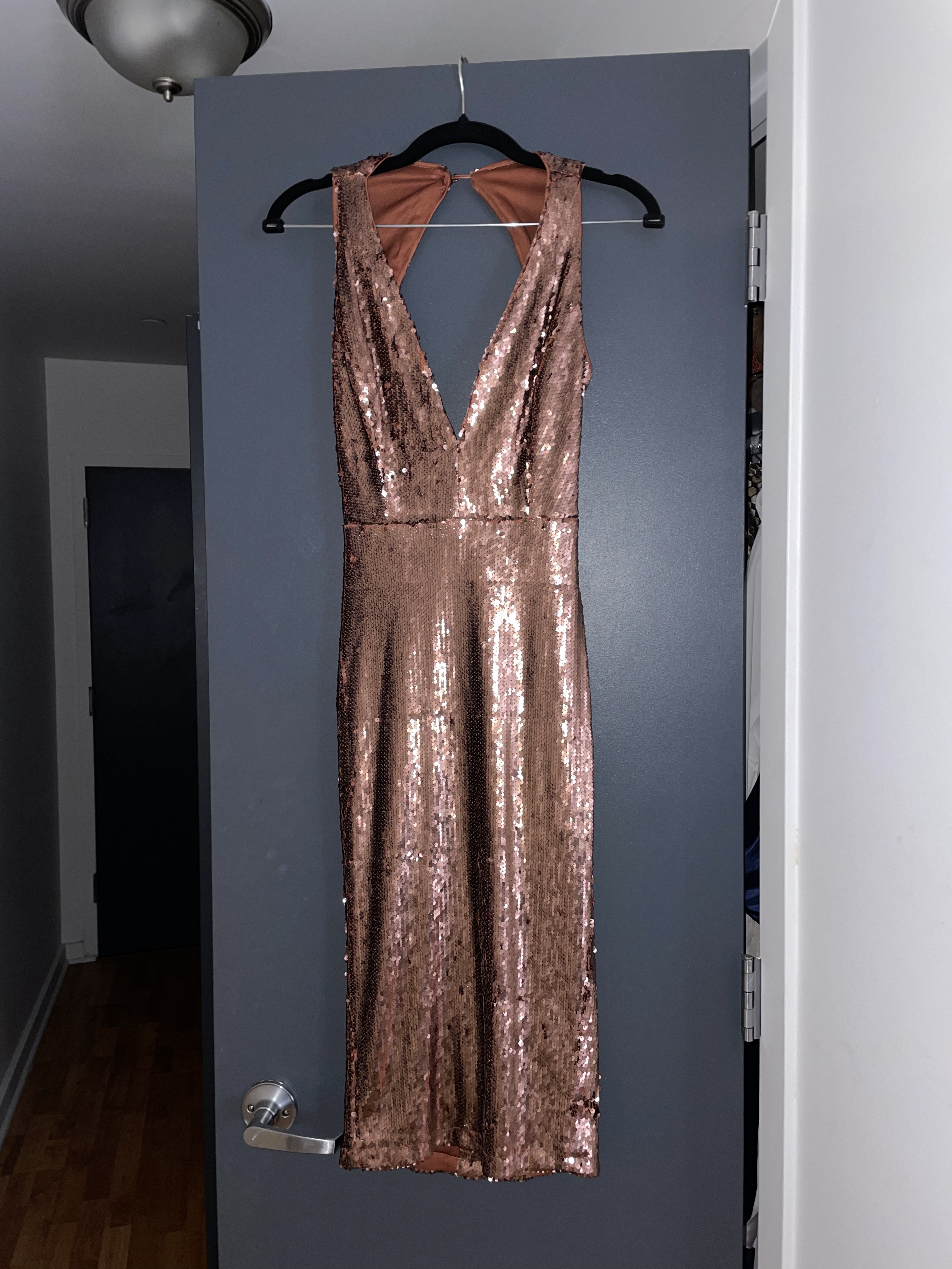 Size small Akira Black Label dress midi sequin dress. The fabric does have some stretch. The dress was only used for a photoshoot. My measurements are 34b-26-36 and I’m 5’7