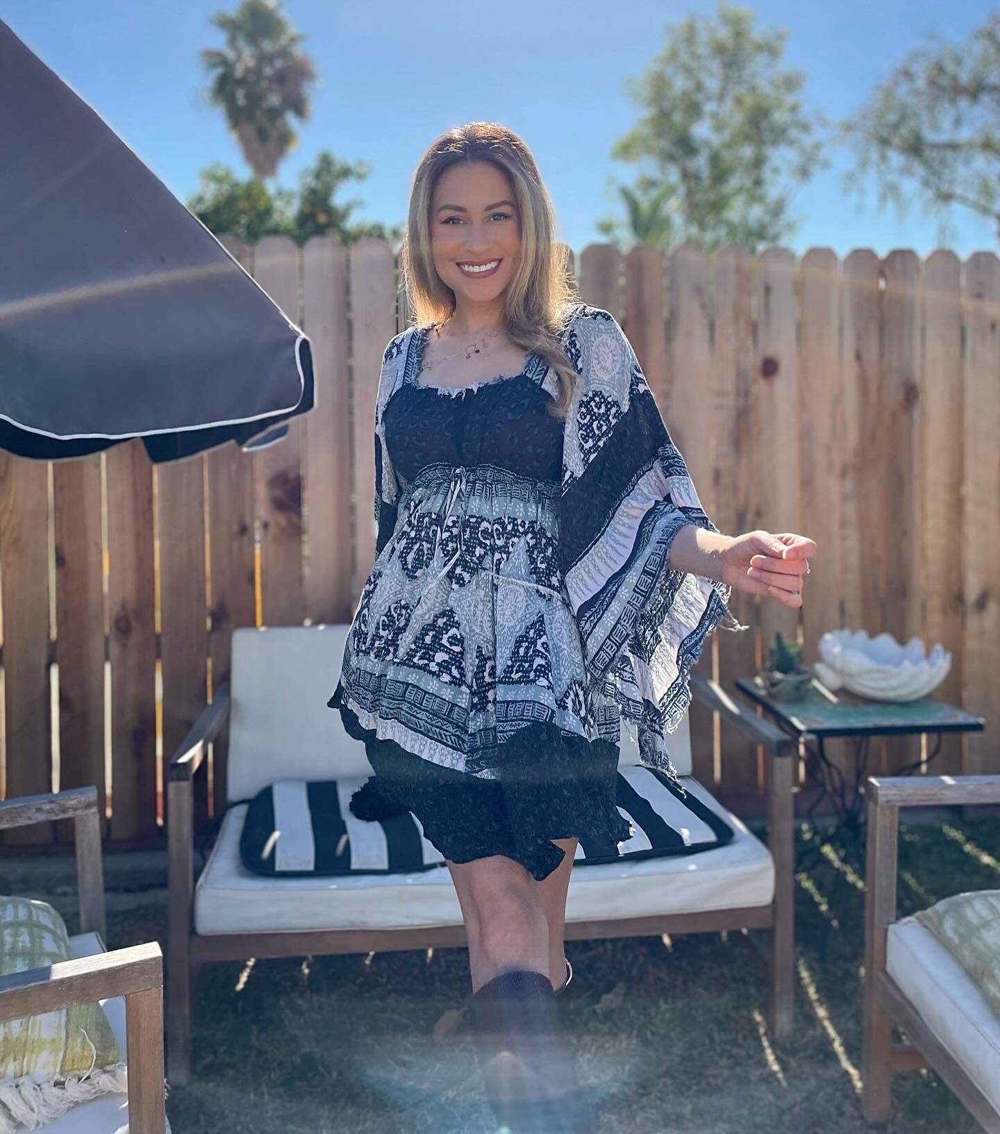 Size small Free People blue print dress. This dress features a drawstring under the bust to create a better fit. Due to it’s cut, this style could fit a medium as well because there is no waist or hip measurement.