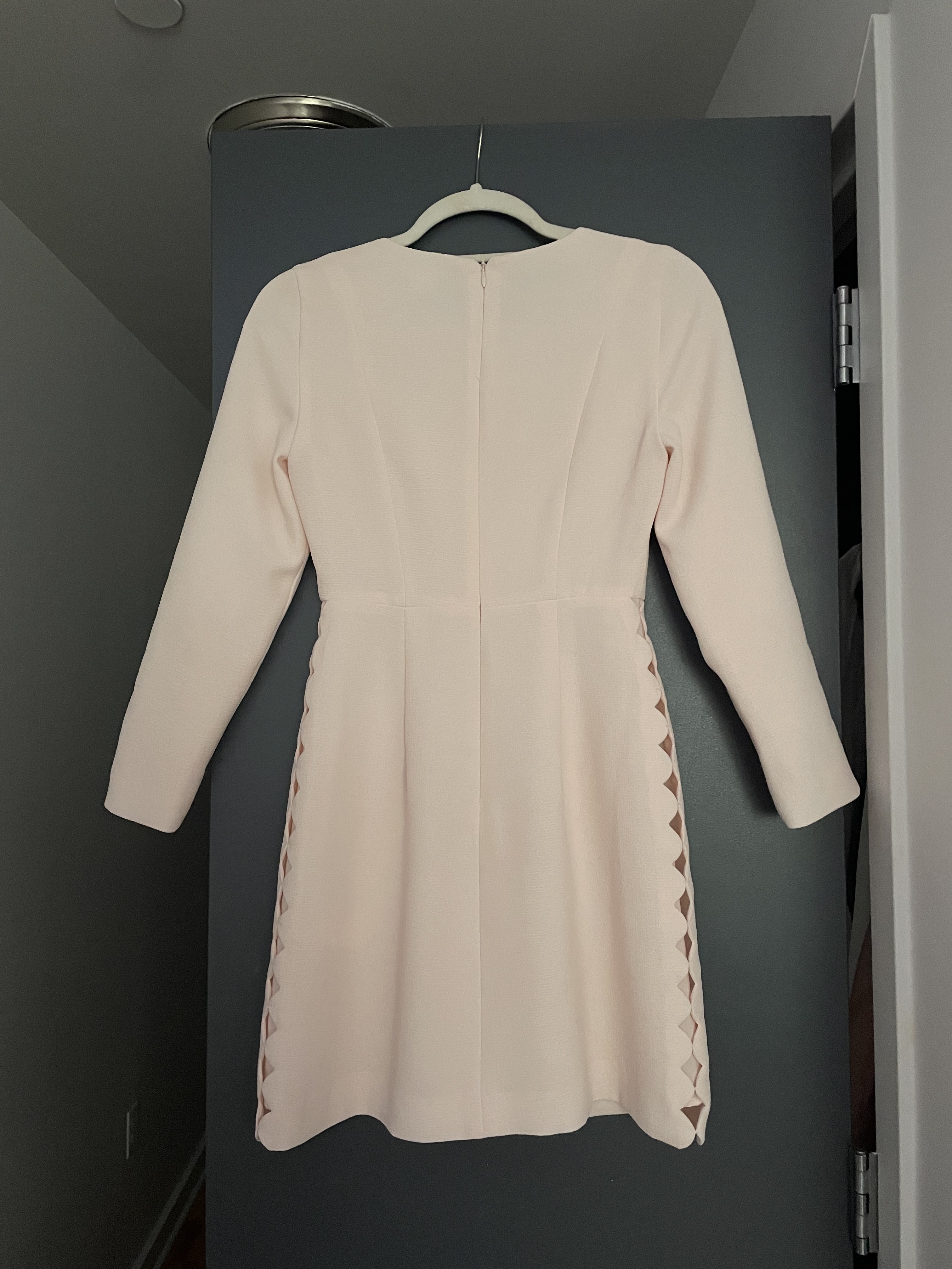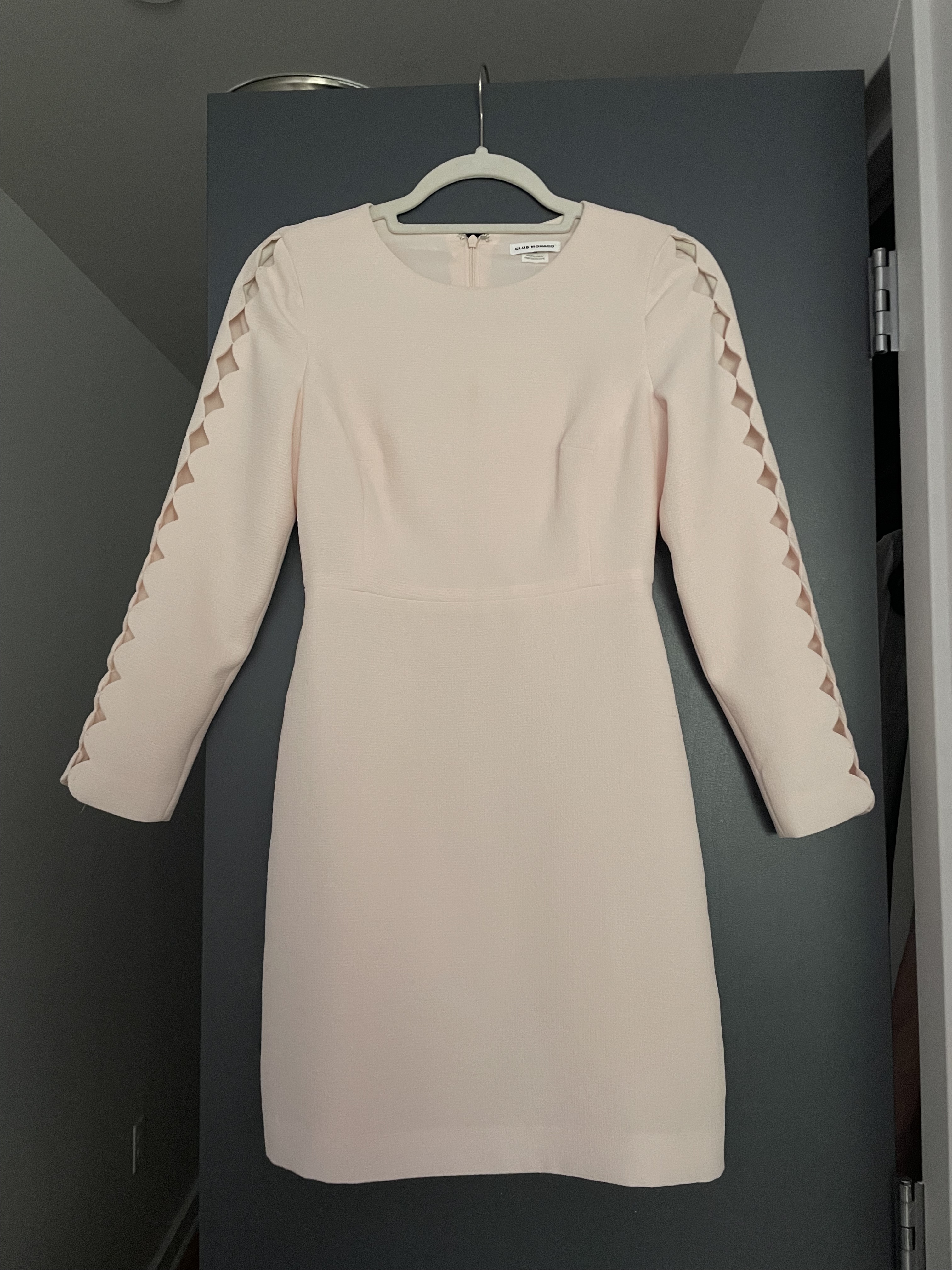 Pale pink Club Monaco dress with scalloped cut out sleeves. This dress was worn once. Originally $200 retail. It’s a size 00 but I typically wear a size 2. It is a little small on me so I decided to sell it. My measurements are 34b-26-36 and I’m 5’7
