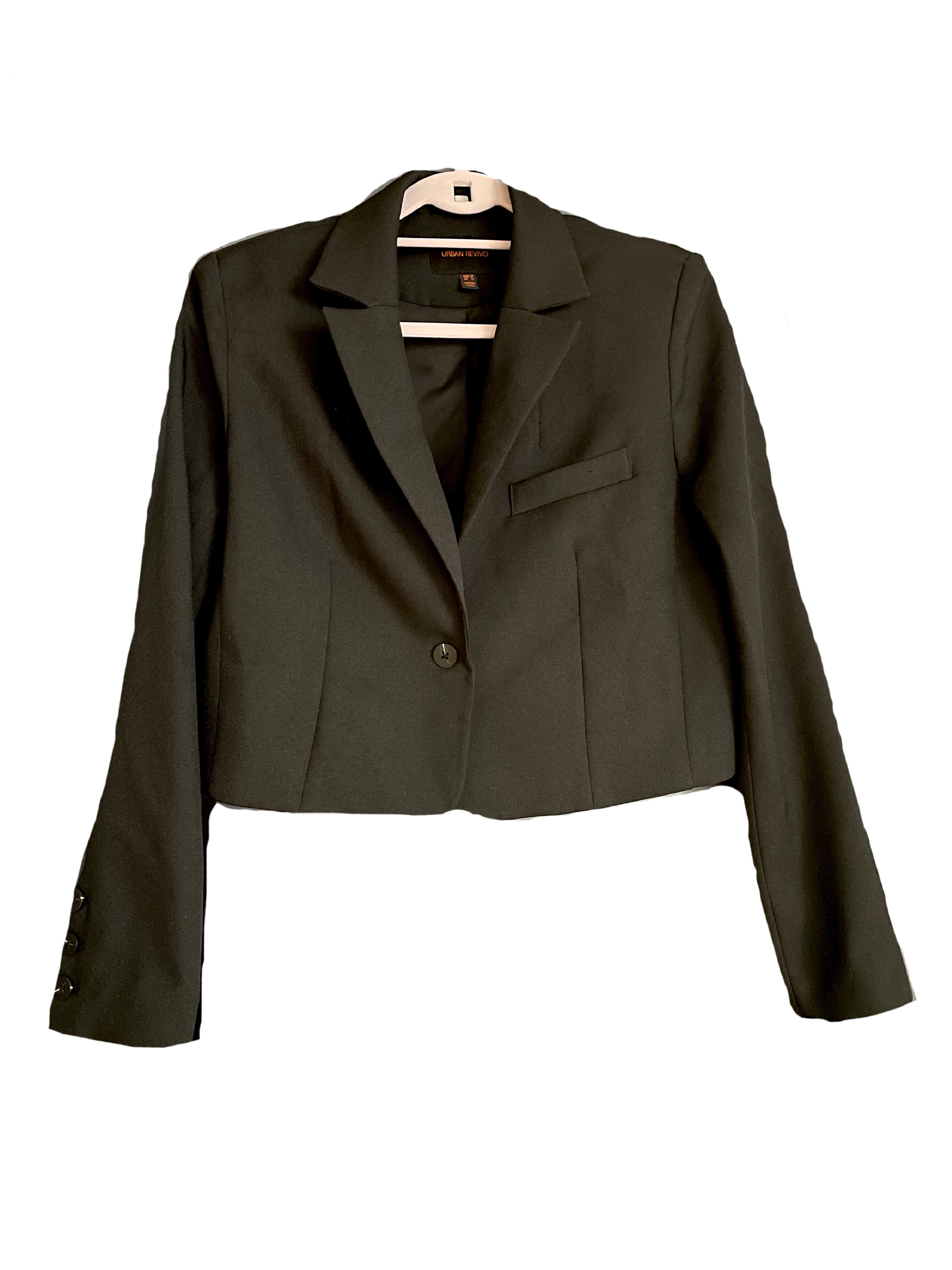 Black Urban Revivo cropped blazer, US size 8. This piece was styled with a pair of black pants and a fringe skirt. The fringe skirt is also available for sale. Retails for $110