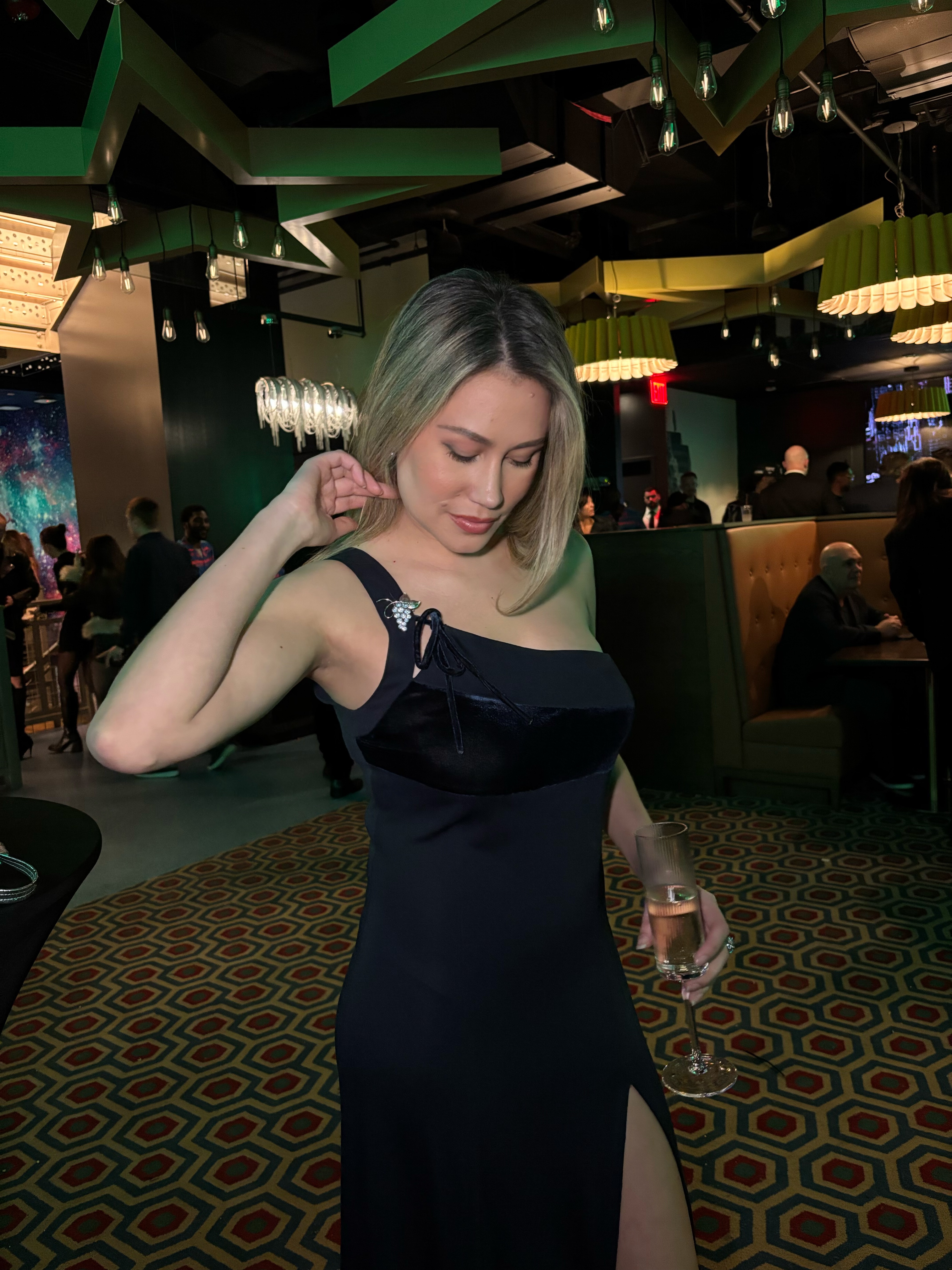 This is a 2000s vintage dress by Courtisane. This dress was taken in slightly but you can see that it’s not skin tight on me and there is stretch in the fabric. The bust has velvet details for a more elevated look. The dress is maxi length but it doesn’t touch the floor so it’s perfect for semi-formal to formal events, so you can comfortably dance in it. I styled this look with a vintage broach, but the broach is not included. My measurements 34b-26-36, 5’7.